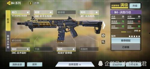 首先,让我们来看看M4的外观。据最新爆料,这次M4将采用全新的外观设计,融入了更多现代军事元素。枪身采用了黑色涂装,线条流畅,给人一种强烈的视觉冲击力。此外,M4还将配备可拆卸的战术配件,如战术手电、激光瞄准器等,让玩家在实战中更具战术优势。